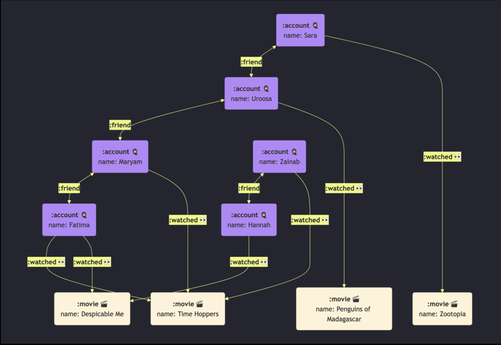 , (n6)-[:watched {watched_at: '2024-01-01T18:30:00Z'}]->(m2);This will create the following graph: