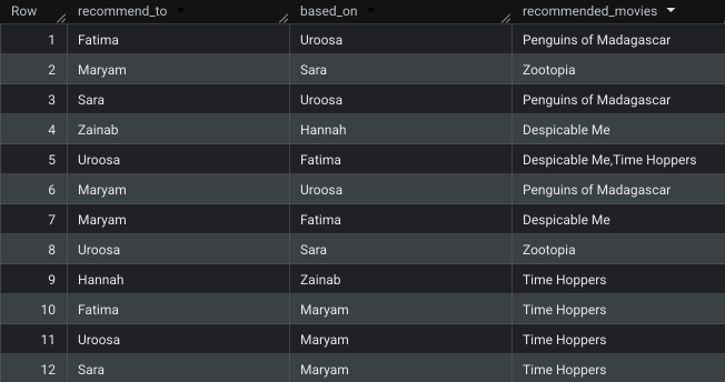 return table(account_b.name as recommend_to , account_a.name as based_on, recommended_movies);This will output